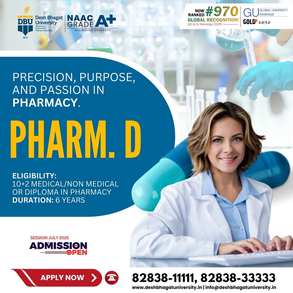Desh Bhagat University (DBU) is one of the respected educational institutions in Punjab offering the Pharm D course. There are many reasons to choose DBU: