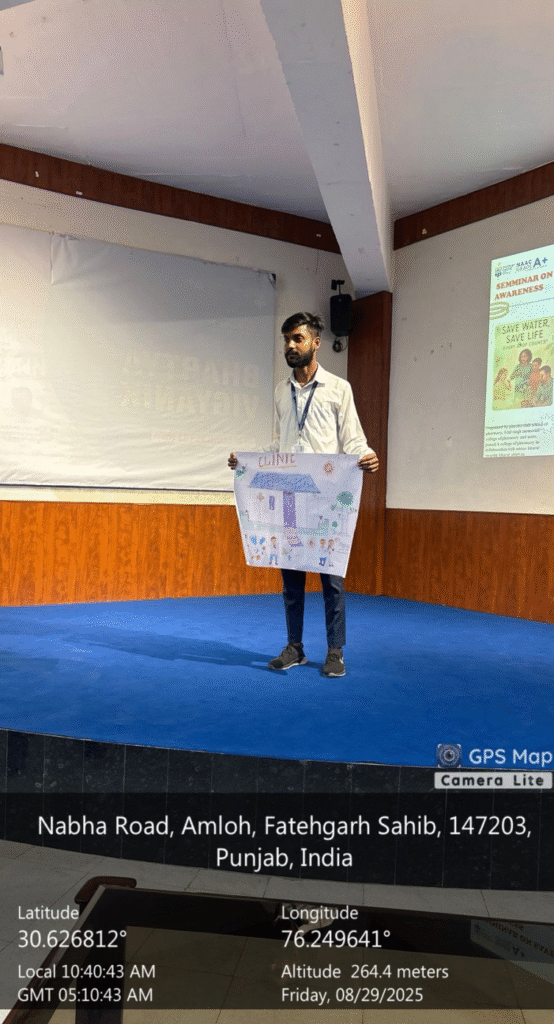 A Save Water Awareness Seminar was organized by placebo club school of pharmacy, S.lal Singh Memorial College of Pharmacy and Mata Jarnail K College of Pharmacy in collaboration with Unnat Bharat\Swachh Bharat Abhiyan Desh Bhagat University to spread awareness among students about the importance of conserving water and adopting sustainable practices.