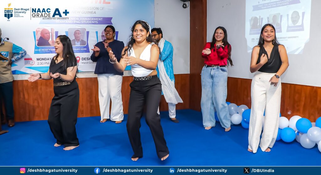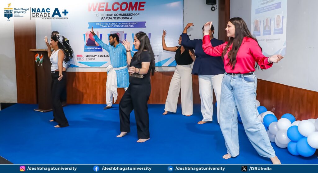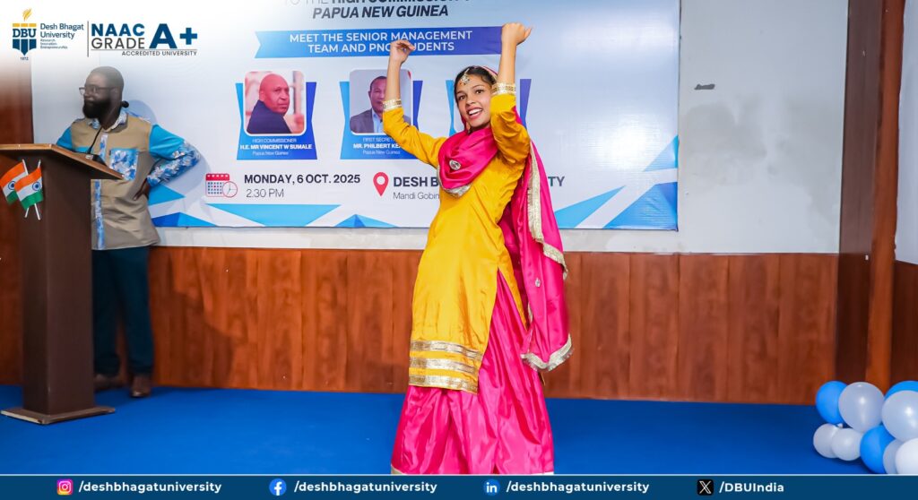 healthcare environment and its strong student support systems. The discussions focused on deepening educational collaboration and the potential signing of a Memorandum of Understanding (MoU) to strengthen academic and cultural relations between Papua New Guinea and Desh Bhagat University. The event featured vibrant cultural performances by students from Papua New Guinea and various Indian states, showcasing traditional music and dance that highlighted the themes of friendship, diversity, and unity. The delegation also engaged directly with the Papua New Guinean student community, lauding their achievements and motivating them to continue striving for academic excellence. The visit reaffirmed Desh Bhagat University’s commitment to fostering a global learning environment built on mutual respect, cultural exchange, and international collaboration.