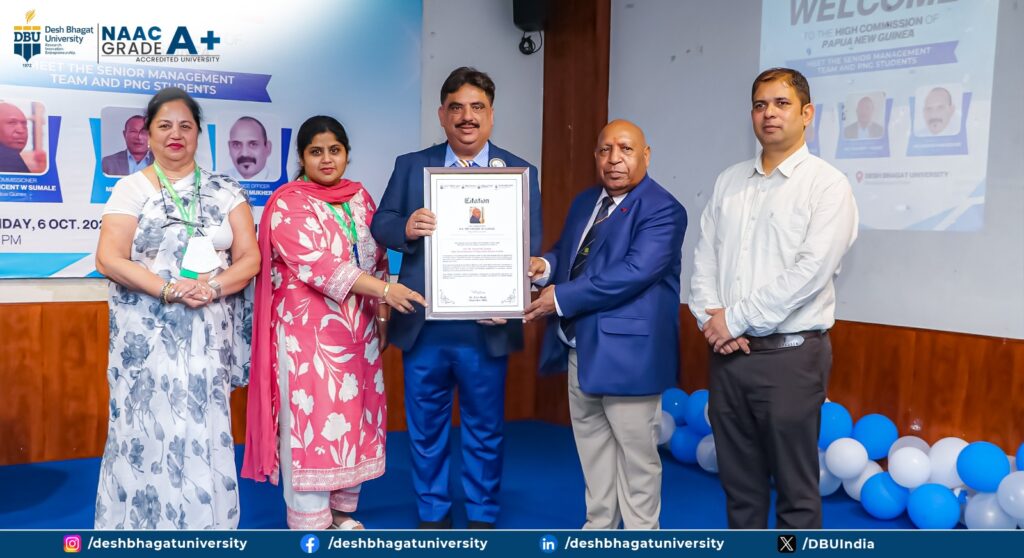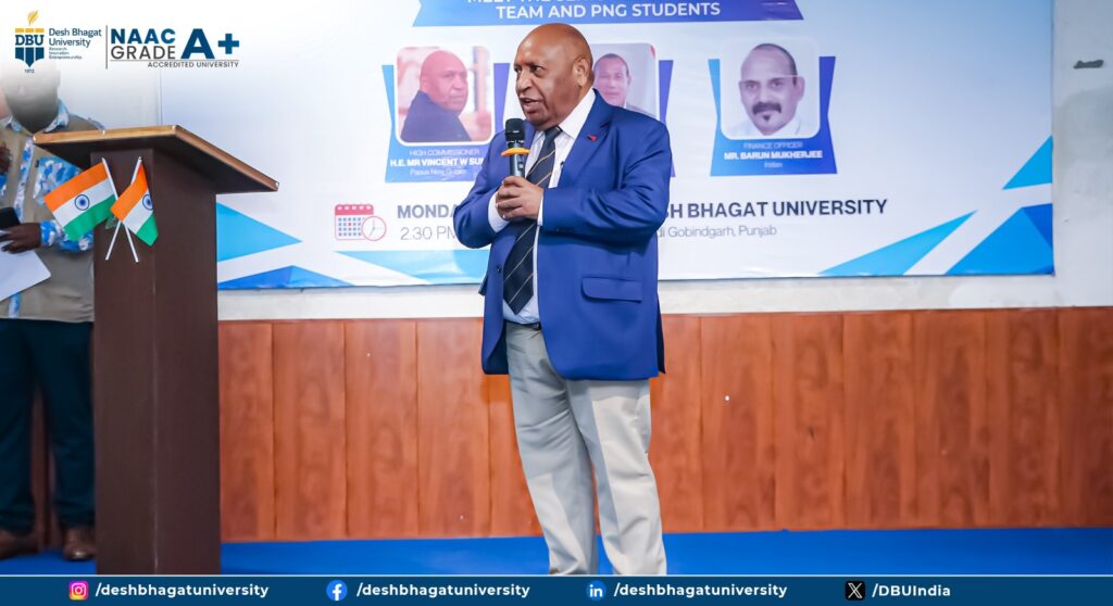 Desh Bhagat University (NAAC A+) in Mandi Gobindgarh extended a warm welcome on 7 September to a distinguished delegation from the High Commission of Papua New Guinea, led by H.E. Mr. Vincent W. Sumale, High Commissioner, along with Mr. Philibert Keaike, First Secretary, and Mr. Barun Mukherjee, Finance Officer. The guests were received by Dr. Zora Singh, Chancellor, and Dr. Harsh Sadawarti, Vice-Chancellor, along with senior officials and Papua New Guinean students currently enrolled at the university. During the visit, the High Commissioner commended the university’s inclusive academic and