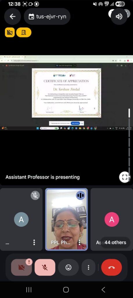 On the occasion of celebration of 3rd National current Good Manufacturing Practice Day Placebo Club, School of Pharmacy, S. Lal Singh Memorial College of Pharmacy and Mata Jarnail K College of Pharmacy in collaboration with IIC and IQAC, Desh Bhagat University, Mandi Gobindgarh organized an online guest lecture on 10th October 2025. Dr. Keshav Jindal, Professor (Pharmaceutics), Adesh Institute of Pharmacy and Biomedical Science, Adesh University, Bathinda was the speaker.