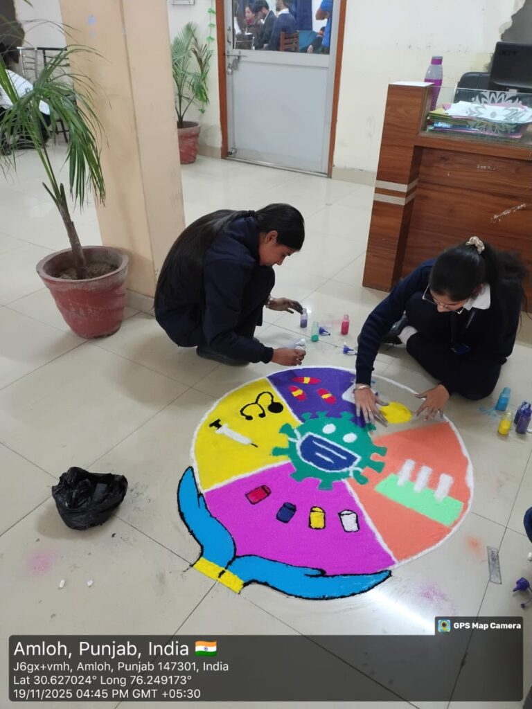 As part of the National Pharmacy Week 2025 celebrations, a Rangoli Competition was organized on 19th November 2025 as part of cultural and creative activities aimed at encouraging artistic expression among students. Participants from B. Pharmacy (all semesters) and Pharm. D enthusiastically took part and showcased their creativity, teamwork, and aesthetic skills. After careful judgment based on creativity, theme presentation, neatness, and overall visual impact, the following winners were declared, 1st Position was secured by Kiranpreet Kaur, Harsimrandeep Kaur, Sanjana Chaurasiya, Sukhdeep Kaur from B. Pharmacy, 5th Semester, 2nd Position was secured by Nandini, Aarti, Satyajeet Chandan Kumar from B. Pharmacy, 1st Semester, and 3rd Position was secured by Kritika Goswami, Neha Kumari, Om Kumar, from B. Pharmacy, 3rd Semester.The event concluded successfully with appreciation for all participants and congratulations to the winners.