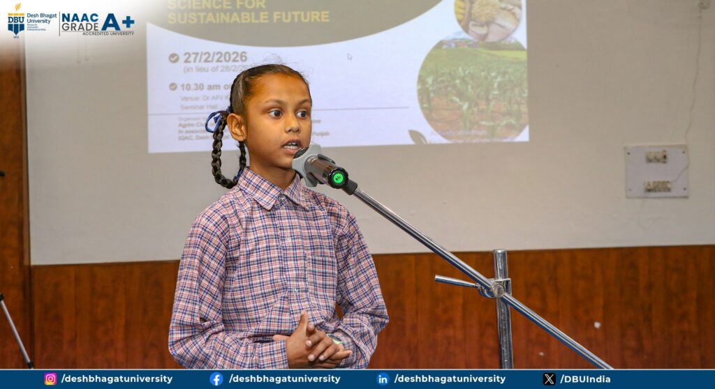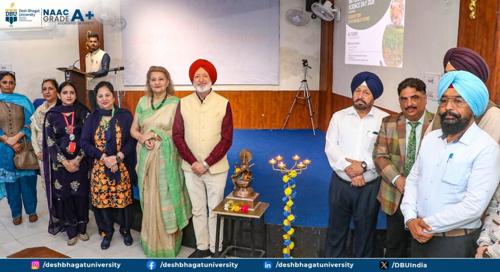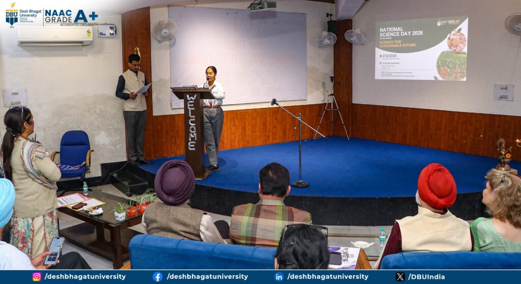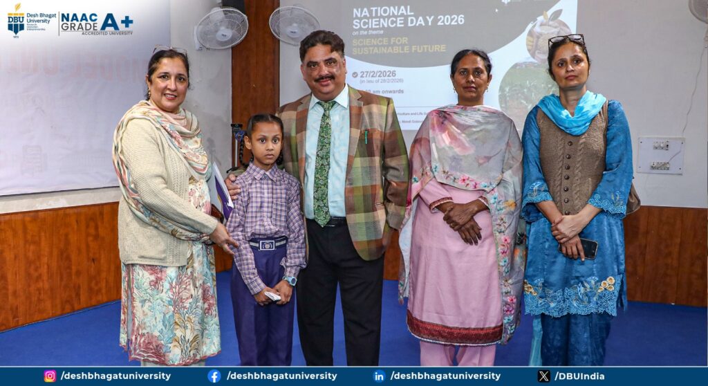 The Agrim Club of the Faculty of Agriculture and Life Sciences, in association with the Internal Quality Assurance Cell (IQAC), successfully celebrated National Science Day 2026 at the Dr. APJ Abdul Kalam Seminar Hall of Desh Bhagat University. The event witnessed enthusiastic participation from around 150 university students and nearly 20 neighboring schools, creating a vibrant platform for scientific dialogue and innovation. Prof. (Dr.) H.K. Sidhu, Dean of the Faculty, formally welcomed the gathering and emphasized the importance of fostering scientific awareness for academic and professional growth. Prof. (Dr.) Ajay Gupta elaborated on the theme, “Science for a Sustainable Future,” stressing its significance in addressing global environmental and developmental concerns. Vice Chancellor Prof. (Dr.) Harsh Sadawarti inspired the audience by highlighting science as the backbone of national and global progress and reaffirmed the university’s commitment to research and technological advancement. The Honourable Chancellor, Dr. Zora Singh, and Pro-Chancellor, Dr. Tajinder Kaur, appreciated the Faculty’s dedicated efforts in nurturing scientific temper among students. The celebration featured engaging activities such as poster presentations, quizzes, and PowerPoint presentations, where students showcased innovative ideas aligned with sustainable development goals. The program concluded with a heartfelt vote of thanks by Dr. Avinash Kumar Bhatia, marking the event as a grand success.